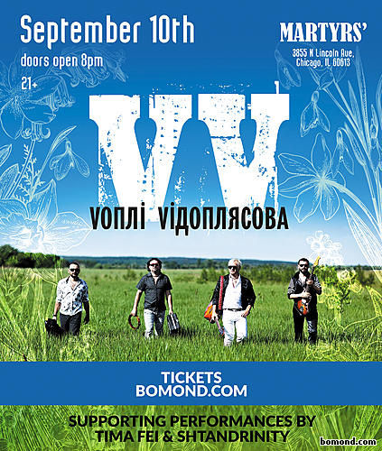 Музиканти запевняють, що цей заокеанський музичний тріп стане спалахом драйву для тих, хто зберігає у серці Україну та вогонь рок-н-ролу. Хто готовий виплеснути власні емоції і отримати навзаєм порцію музичного натхнення на увесь рік! У рамках туру, ВВ зіграють нові композиції і добре знані хіти: «Танці», «Весну», «День Народження», «Галю», які запалюють серця мільйонів шанувальників у різних країнах світу етно-драйвом та музичною енергією! Відтак, своїм заокеанським шанувальникам ВВ обіцяють максимально запальний та яскравий початок осені! Дата: 10 сентября Время: 8:00 p.m. Адрес: Martyrs, 3855 N. Lincoln Ave., Chicago, IL